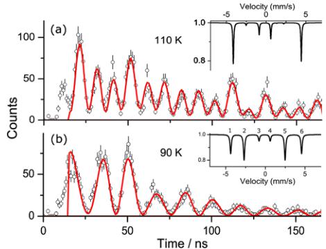 FIG. 3 (color online). Time evolution of NFS for fully ordered \( TiFe_{1.6}Se_{2} \) crystal with the c axis parallel to the x-ray beam measured above and below the magnetic transition. The data (open circles) are fit by models (red lines) with magnetic moments aligned with the c axis at 110 K, and lying in the ab plane at 90 K. The insets are the model simulations of Mössbauer spectra, with the lines numbered in the inset of (b).