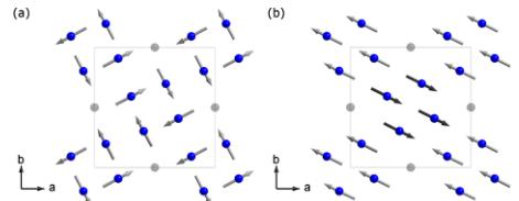 FIG. 4 (color online). The Fe (blue) lattice with different magnetic structures that describe the neutron diffraction data below 100 K. (a) A noncollinear magnetic structure that describes the neutron diffraction data and retains the symmetry of the crystal structure. (b) An in-plane, block-checkerboard antiferromagnetic structure that describes the neutron diffraction data provided an equal mixture of domains rotated \( 90^{\circ} \) about c exists. In both (a) and (b), the moments (arrows) are antiferromagnetically aligned between Fe planes along the c axis, and vacant Fe sites are shown as light gray spheres without arrows.