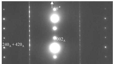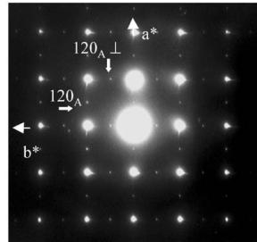 The first set of reflections, correspond to the A-type orthorhombic cell, \( a_{A} \approx a_{p} \sqrt{2} \) , \( b_{A} \approx a_{p} \sqrt{2} \) and \( c_{A} \approx 12.08 \, \AA \) , previously reported for \( Ca_{2}MnO_{4} \) [20], compatible with the space groups \( Aba2 \) (No. 41) and \( Abma \) (No. 64). In the following, the suffix “A” refers to these A-type lattices. Two typical ED patterns given in Fig. 1 illustrate the micro-twinning phenomena generated by the orthorhombic distortion of the cell. In the [001] pattern (Fig. 1a), the \( h \, k \, 0 \) , \( h = 2n + 1 \) , reflections are pointed by white arrows but weaker reflections are also observed along the horizontal axis (apparently \( b^{*} \) ), as a result of \( 90^{\circ} \) oriented domains, the \( b^{*} \) and \( a_{\perp} \) vectors of the two variants being parallel. The formation of twinning domains is also clearly illustrated in Fig. 1b, by the systematic superimposition of the [120] and [210] variants. Along that direction, diffuse streaks appear parallel to \( c^{*} \) , which have been interpreted as the signature of “nano-twinning” [20], the bright field imaging revealing domains of a few nanometers thickness along c.