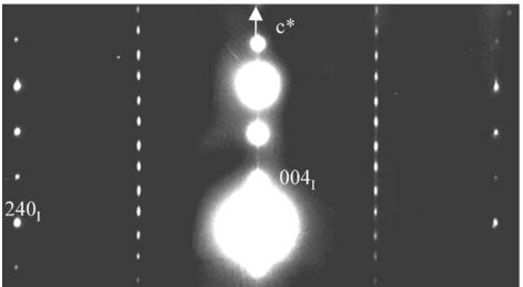 Fig. 1. \( Ca_{2}MnO_{4} \) ED patterns: (a) 4-type structure, [001] ED pattern: white arrows point the extra reflections associated to the orthorhombic distortion, the weaker ones resulting from a twinning phenomenon. (b) Systematic superimposition of the [120] and [210] variants: the diffuse streaks parallel to \( c^{*} \) are the signature of “nano-twining” (c) [120] ED pattern of a crystal zone exhibiting the \( I4_{1}/acd \) structure.