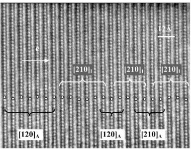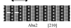 parameters obtained from NPD calculations (next section). The [100] and [010] patterns and HREM images do not provide significant difference of contrast. Conversely, viewing the crystals along the \( \{210\}_{I} \) direction of the \( I4_{1}/acd \) -phase or along the \( [210]_{A} \) and \( [120]_{A} \) directions of the \( Aba2 \) -phase allows to clearly observe a variation of the contrast at the level of the \( [MnO_{2}] \) planes. This is illustrated in Fig. 2a, using the refined atomic positions (Table 1) and keeping a similar oxygen displacement for the orthorhombic phase; the images are calculated for a focus value close to -550 Å (Scherzer value), a crystal thickness of 48 Å and an objective aperture of 0.9 Å \( ^{-1} \) . The displacement of the oxygen atoms of the basal plane of the octahedra induces alternately shorter and longer projected spacing, resulting in the sequence of bright and less bright dots along a row perpendicular to \( \vec{c} \) . Adjacent rows are shifted by \( d_{210} \) or not shifted, so that three possible arrangements are theoretically observed along \( \vec{c} \) ; they are schematically drawn in Fig. 2b. In the \( \{210\}_{I} \) images, the sequence along \( \vec{c} \) is white–dark–dark–white, due to the \( 4_{1} \) axis, whereas there is no shift in the \( [210]_{A} \) images and white and dark spots alternate in the \( [120]_{A} \) images. Note that for this focus value, the Abma calculated images do not exhibit this typical alternation of bright and less bright dots, in agreement with the special positions of the oxygen atoms, but a different grey and uniform contrast at this level. Thus, taking into consideration the experimental observations, the A-type domains can be described in the Aba2 space group only. HREM images display another interesting information on the origin of the streaks observed in the ED patterns along \( c^{*} \) . One example is shown in Fig. 2c, where the bright dots positions are marked by white circles. They first confirm the perfect Ruddlesden–Popper type structure, without intergrowth defects. Second, the sequence of shifting of the rows along \( \vec{c} \) delimits four domains, which are only a few nanometers thick. The streaks can be correlated to two types of distortion of the octahedral layers and to their more or less ordered stacking mode, leading to the formation of nano-twinning domains.