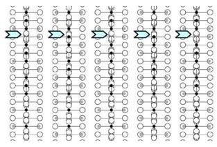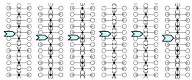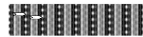 Fig. 2. Characterization of the I-type structure in \( Ca_{2}MnO_{4} \) : (a) Calculated images (focus value close to \( -550\AA \) , crystal thickness of \( 48\AA \) , objective aperture of \( 0.9\AA^{-1} \) ) of the different structures. (b) Drawing of the three possible arrangements corresponding to the images given in (a): along \( \{210\}_{I} \) , \( [210]_{A} \) and \( [120]_{A} \) . The shifting, or not, of the dots along c in the adjacent layers is outlined by open arrows. Grey circles are for Ca, black for Mn and white for O. (c) Typical experimental HREM of a crystallite exhibiting streaks along \( c^{*} \) : the bright dots positions are marked by white circles.