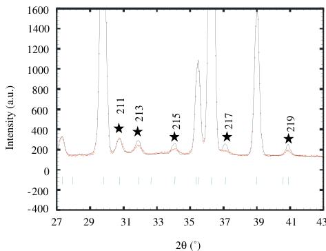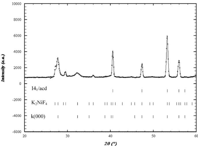 The main peaks of this room temperature pattern correspond to an \( I4/mmm\ K_{2}NiF_{4} \) structure ( \( a \approx a_{p} \) and \( c \approx 12\ \AA \) ) but weak reflections, notified by stars in Fig. 3, indicate that the structure has to be described in the \( I4_{1}/acd \) , in agreement with the electron microscopy study, with \( a \approx a_{p}\sqrt{2} \) and \( c \approx 24\ \AA \) . No orthorhombic distortion could be detected from NPD data, due to the coexistence of quadratic and orthorhombic phases and to the too small distortion of the orthorhombic form. The refinement performed in \( I4_{1}/acd \) allowed all the peaks to be indexed, with the following reliability factors \( R_{p} = 10.7\% \) , \( R_{wp} = 12\% \) and \( R_{Bragg} = 6.18\% \) and \( \chi^{2} \) close to 18.4. However, a close inspection of the patterns revealed an anomalous width for the reflections that differentiate \( I4_{1}/acd \) from \( I4/mmm \) with the rule: \( hk\ l \) , \( l = 2n + 3 \) , indicating a shorter coherence length along the c-axis. Two profiles were thus used to refine these data, one for the intense reflections and the other for the peaks belonging to the rule \( hk\ l \) , \( l = 2n + 3 \) . This refinement improved significantly the results with \( R_{p} = 5.5\% \) , \( R_{wp} = 5.89\% \) , \( R_{Bragg} = 2.32\% \) and \( \chi^{2} \) close to 4.61 [34]. Let us note that the O(2) B factor, that was refined to a slightly high value ( \( >1\ \AA^{2} \) ) in the