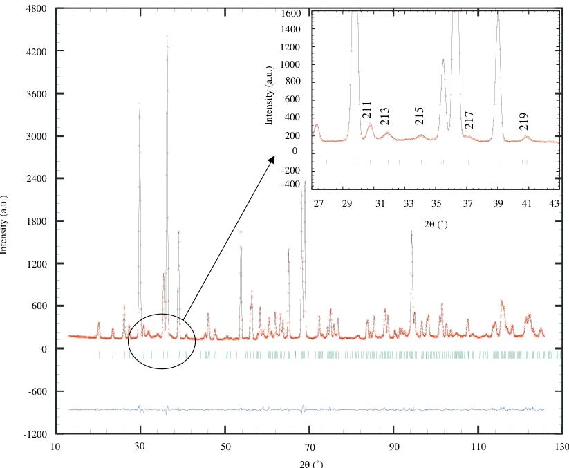 Fig. 4. Final refinement, with experimental (+), calculated (−) and difference NPD patterns of \( Ca_{2}MnO_{4} \) , in insert enlargement showing the good peak shape for all the reflections.