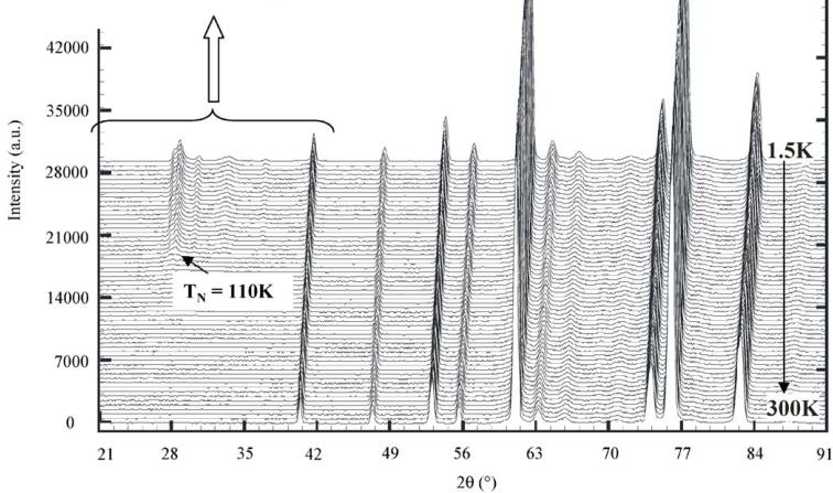 NPD experiments were performed at the Orphée reactor (CEA/Saclay, France), on the two-axis diffractometers 3T2 ( \( \lambda = 1.225 \AA \) ) and G4.1 ( \( \lambda = 2.426 \AA \) ). The temperature dependence of the magnetic and crystalline structure was studied by recording data from 1.4 K to 300 K by 5 K steps on G4.1 (in the angular range \( 11^{\circ} < 2\theta < 91^{\circ} \) by step of \( 0.1^{\circ} \) ). A measurement ( \( 6^{\circ} < 2\theta < 125.7^{\circ} \) by step of \( 0.05^{\circ} \) ) has been done on 3T2 at 300 K. All these data were refined with the Fullprof program [32].