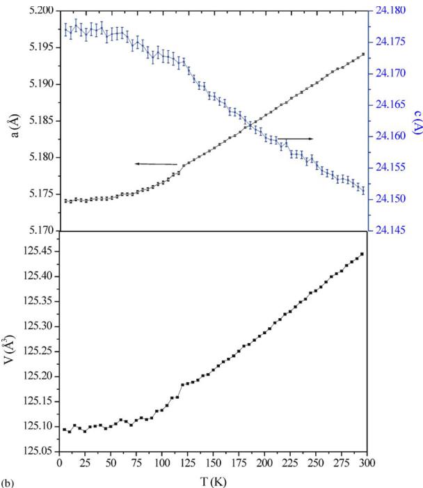 Fig. 5. Temperature dependence of the NPD patterns registered on the G4.1 diffractometer from 1.5 to 300K for \( Ca_{2}MnO_{4} \) with an enlargement of the small angles part for selected temperatures (a) and corresponding temperature dependence of the lattice parameters (b).