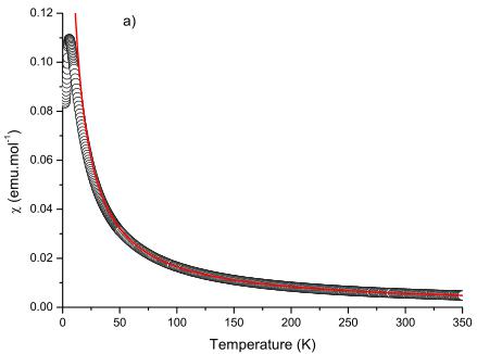 LiCrGe_{2}O_{6} and LiCrSi_{2}O_{6} is shown in Fig. 1. We fitted the magnetic susceptibility with a Curie-Weiss temperature dependence defined by \( \chi=\frac{C}{T-\theta} \) . The fit was made in the range 100 to 350 K. Below around 75 K, the magnetic susceptibilities depart from the Curie-Weiss model for both compounds. The determined effective moment is \( \mu_{eff}=3.6998(5)\mu_{B} \) and