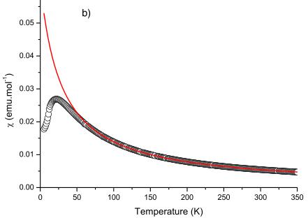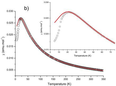 FIG. 3. (Color online) Temperature dependence of the magnetic susceptibility \( \chi \) for a) \( LiCrGe_{2}O_{6} \) and for b) \( LiCrSi_{2}O_{6} \) . The solid line represents the best fit of the experimental data to Eq. (2) for (a) T>15 K ( \( LiCrGe_{2}O_{6} \) ) and for (b) T>22 K ( \( LiCrSi_{2}O_{6} \) ).