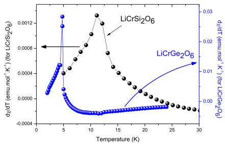 FIG. 2. (Color online) Derivative of the magnetic susceptibility emphasizing the long range magnetic order below \( T_{N}=11.1(5) \) K for \( LiCrSi_{2}O_{6} \) and \( T_{N}=4.8(2) \) K for \( LiCrGe_{2}O_{6} \)