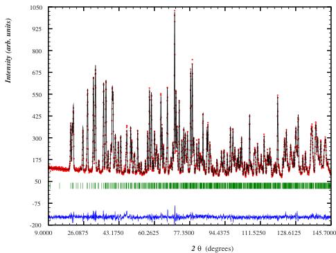FIG. 4. (Color online) Neutron powder pattern ( \( \lambda=1.594 \) Å) of \( LiCrGe_{2}O_{6} \) sample collected at 10 K using the D2B diffractometer. The refinement has been done in the \( P2_{1}/c \) space group with the following statistics: \( R_{p}=3.33\% \) and \( R_{wp}=4.28\% \) .