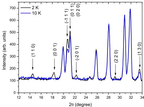 FIG. 5. (Color online) Fragment of the D2B neutron diffraction pattern of \( LiCrGe_{2}O_{6} \) at 2 and 10 K. New reflections appear and/or increase in intensity which can be described with a magnetic propagation vector k=0.