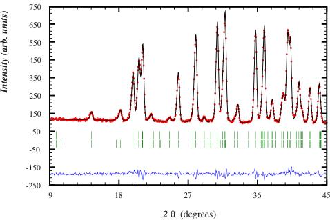 germanium monochromator. The neutron detection is performed with \( {}^{3} \) He counting tubes spaced at \( 1.25^{\circ} \) intervals for D2B. A complete diffraction pattern is obtained after 25 steps of \( 0.05^{\circ} \) in \( 2\theta \) . Diffraction data analysis was done using the FullProf refinement package. \( ^{18} \)