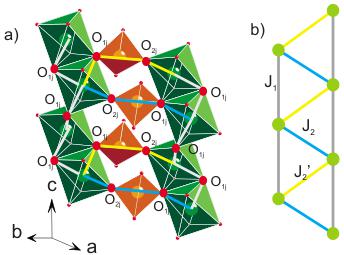 FIG. 8. (Color online) (a) The \( CrO_{6} \) zigzag chains separated by \( GeO_{4} \) tetrahedra. We indicated in gray, blue and yellow the main magnetic exchange interactions. We emphasize the oxygens \( O_{1j} \) and \( O_{2j} \) which are involved in the magnetic exchange paths (b) We show the equivalent magnetic lattice keeping the same color code. \( J_{1} \) is of magnetic superexchange type, while \( J_{2} \) and \( J_{2}^{\prime} \) are of super-super-exchange type. \( J_{1} \) magnetic exchange path goes via \( Cr-O_{1j}-Cr \) , while \( J_{2} \) and \( J_{2}^{\prime} \) , go via \( Cr-O_{1j}-O_{2j}-Cr \) .