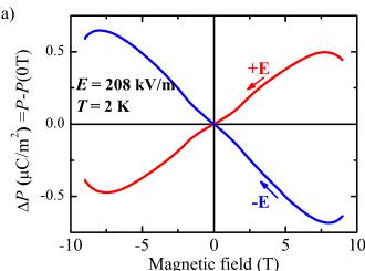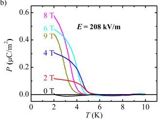 FIG. 9. (Color online) (a) The \( \Delta P[=P(H)-P(0)] \) versus H curve between -9 and 9 T, and (b) P versus T curves from 2 to 10 K at various fixed H, obtained from integration of magnetoelectric and pyroelectric currents, respectively. A constant E=208 kV/m perpendicular to H was applied during the measurements.