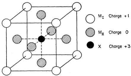 FIG. 1. Crystal structure of \( (M_{II})_{3}M_{I}X \) -type compounds. Charges refer to model as described in Sec. IV of text.