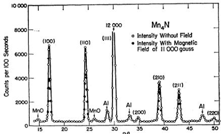 MANGANESE nitride is a representative of a series of transition metal carbides and nitrides which have the simple structure shown in Fig. 1. From a structural viewpoint, the chemical formula can be written as \( (M_{\mathrm{II}})_{3}M_{\mathrm{I}}X \) , where \( M_{I} \) is the corner atom, \( M_{II} \) , the three face-centered atoms, and X, the carbon or nitrogen which is at the body-centered position. Examples of other compounds belonging to this series are \( Fe_{4}N_{1} \) , \( Fe_{3}NiN_{1} \) , and \( Mn_{3}AlC \) . It is known that the carbon or nitrogen can deviate from unity, the nitrogen in \( Mn_{4}N \) having a range of 0.7 to 1.2.