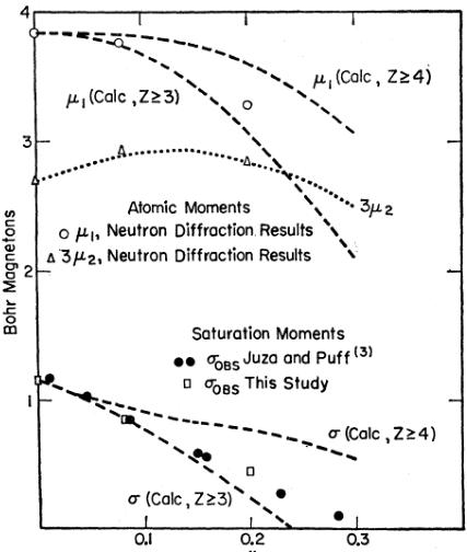 Juza and Puff \( ^{1} \) showed that partial replacement of the nitrogen in \( Mn_{4}N \) by carbon or vacancies decreased the saturation moment. Their model for \( Mn_{4}N \) was used as an explanation for this decrease. This model had a corner moment of \( 3.2\mu_{B} \) and a face-centered moment of \( 2.0\mu_{B} \) antiparallel to the other two face-centered moments of \( 2.0\mu_{B} \) to give the net moment of \( 3.2+2.0-2(2.0) \) equal to \( 1.2\mu_{B} \) . It was assumed that only the antiparallel face-centered moments of \( -2.0\mu_{B} \) were affected by the substitutions, changing to the corner type with a moment of \( -3.2\mu_{B} \) . Thus, a greater fraction of the positive moments were cancelled and the net moment reduced by \( 3.2-2.0 \) or \( 1.2\mu_{B} \) for each change. Three face-centered Mn were changed by each nitrogen vacancy and one by each carbon substitution.