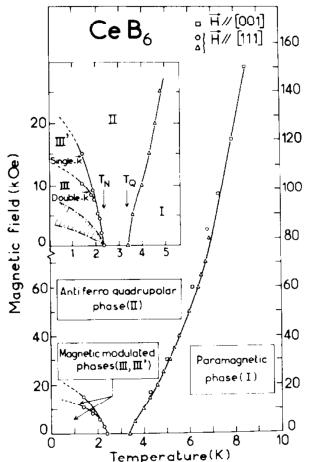 ing of wave vector \( k = [1/2\ 1/2\ 1/2] \) . At lower temperatures, \( CeB_{6} \) develops a magnetic ordering, corresponding to phase III, with a double-k commensurate structure of wave vector \( k = [1/4\ 1/4\ 1/2] \) . In phase I, \( CeB_{6} \) exhibits a typical dense Kondo behaviour which is certainly enhanced by the larger degeneracy of the \( \Gamma_{8} \) ground state. Therefore the magnetic properties of \( CeB_{6} \) are dominated by the interplay of single site virtual fluctuations of Kondo type ( \( T_{K} \) ) and of quadrupolar ( \( T_{Q} \) ) and magnetic ( \( T_{N} \) ) intersite interactions. In \( CeB_{6} \) , \( T_{K} \) and \( T_{Q} \) are of the same order of magnitude giving rise to a Kondo reduced AFQ ordering, but they dominate \( T_{N} \) . This is particularly demonstrated by the huge increase of \( T_{Q} \) and of the specific heat anomaly with the applied field. Such a behaviour can be hardly understood with a classical mean field treatment within a \( \Gamma_{8} \) ground state. We believe that the dense Kondo state prevents the indirect interactions to establish the AFQ ordering, as it does for the magnetic ordering when only a spin S = 1/2 doublet is considered. So in zero field \( T_{Q} \) and the ordered quadrupolar moment are reduced; but with increasing magnetic field the Kondo state is progressively suppressed and so the AFQ ordering can develop at higher temperatures.