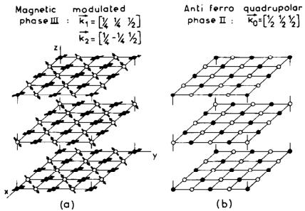Fig. 2. (a) Magnetic structure of the phase III; (b) antiferroquadrupolar structure of phase II.