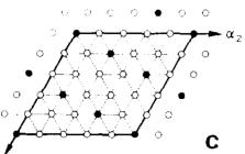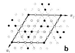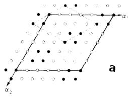 Fig. 3. Arrangement of moments of Fe ions in the (001) plane parallel (open circles) and antiparallel (closed circles) to the external field. (a) Ferromagnetic multi-k structure phase F1. The unit cell is \( 6a \times 6a \times c \) (full line) and the elementary unit cell \( 2\sqrt{3}a \times 2\sqrt{3}a \times c \) , (dashed line). (b) Ferromagnetic multi-k structure F2. The magnetic unit cell is \( 5a \times 5a \times c \) . (c) Ferromagnetic single-k structure F4 defined by the wave vector k (F4) = \( [1/5\ 2/5\ 0] \) .