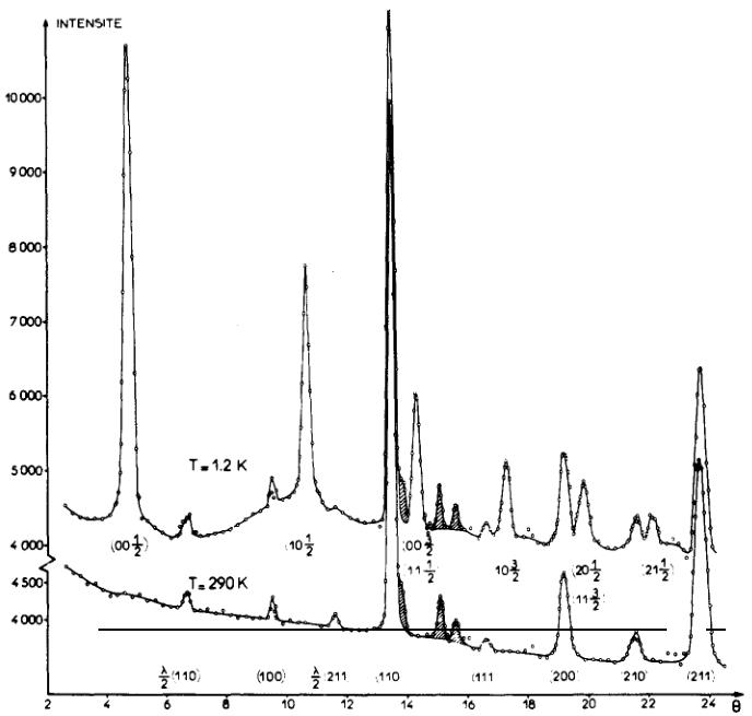 FIG. 1. Diagrammes de diffraction neutronique enregistrés à température ambiante et à T = 1,2 K pour HoRh; les raies hachurées proviennent du cryostat.