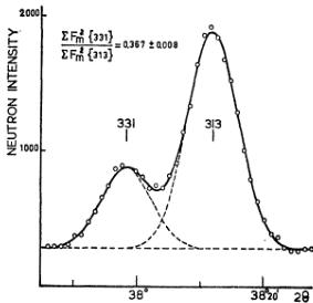 FIG. 2. Neutron diffraction peaks \( \{331\} \) and \( \{313\} \) .