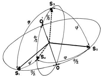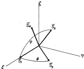 As we have only six eqs. (20) and (25) for 8 unknown quantities, we can introduce two arbitrary parameters, say the angles \( \varphi \) between \( S_{1} \) and \( S_{2} \) , and \( \psi \) between \( S_{1} \) and \( S_{3} \) (see Fig. 13). Then the simultaneous eqs. (20) and (25) can be solved straight forwardly and the solution is listed in Table VI. There, another parameter \( \psi' \) is