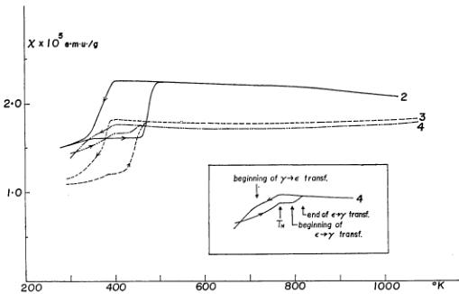 In the alloys No. 2 to No. 5, an x-ray examination revealed that the \( \gamma \) and \( \varepsilon \) phases coexist at room temperature. Their representative \( \chi-T \) curves above room temperature are shown in Fig. 1, in which the \( \chi-T \) curves can be seen to exhibit complicated behavior around \( 400^{\circ}K \) such as thermal hysteresis and discontinuities. The extent of thermal hysteresis was rather variable from cycle to cycle on heating and cooling, and accordingly the values of \( \chi \) at room temperature were different after each cycle. The temperatures where the breaks occur, however, were very reproducible. The amount of thermal hysteresis is thought to be sensitively dependent on the cooling rate of the sample. The thermal hysteresis itself is considered to arise from the reported matensitic transformation \( ^{6} \) between the \( \gamma \) and \( \varepsilon \) phases of the alloy. In order to find any possible correlation between this transformation and the magnetic transformation which is expected to occur in the same temperature range, detailed