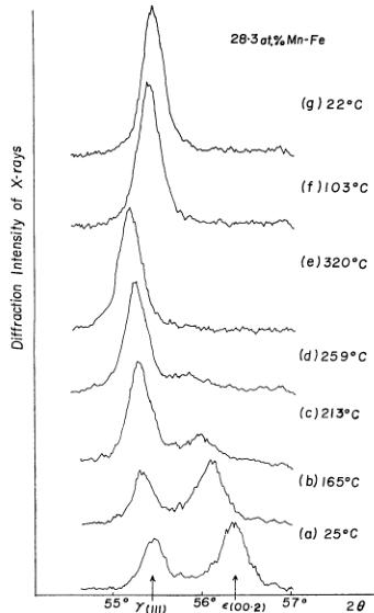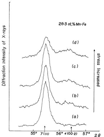 Although ordinary heat treatment gave a single \( \gamma \) phase, the \( \varepsilon \) phase appeared when the samples were stressed at room temperature. Figure 2 gives the changes in the main peaks of the x-ray diffraction pattern of the \( \gamma \) and \( \varepsilon \) phases when the surface of the sample was polished with emery paper. The two-phase state was also realized by cooling sample No. 7 from \( 800^{\circ} \) C under a shearing stress of about \( 10 \, g/cm^{2} \) . The temperature variation of the main peaks of both phases was studied