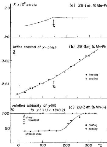 at about \( 270^{\circ} \) C. The \( \gamma \) phase is then stable even if it is cooled to room temperature. The lattice constant of the \( \gamma \) phase is found to have a break at about \( 150^{\circ} \) C. The temperature dependence of the magnetic susceptibility of sample No. 6 was measured in the stable \( \gamma \) phase during subsequent heating and cooling and is shown in Fig. 4(a).