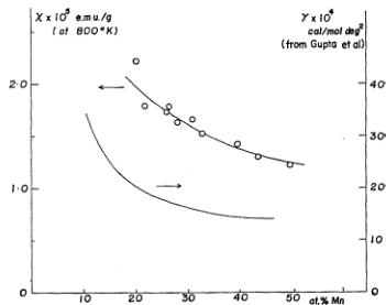 The composition dependence of the nearly constant susceptibility above \( T_{N} \) was found to be very similar to that of the electronic specific heat coefficient \( \gamma \) obtained by Gupta et al. \( ^{7)} \). The ratio of the susceptibility at \( 0^{\circ}K \) to \( \gamma \) and the tendency of the susceptibility to increase at high temperatures were found to be reasonably consistent with a simple band model. These facts suggest that the collective electron model is a better approximation in this alloy although a more rigorous approach is needed for further discussion. One of the interesting problems which remain to be investigated is to find if any difference in the magnetic behavior of Fe and Mn atoms in the Fe-Mn alloy can be detected. This will be a subject of a forthcoming paper.