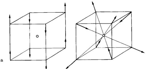 \( W_{D} \) ne contient que des termes de la forme \( S_{0\alpha} S_{j\alpha} \) ; par conséquent \( W_{D} \) est la somme des énergies dipolaires des configurations colinéaires sur 0x, 0y et 0z de moment \( S/\sqrt{3} \) . La valeur minimum de cette énergie est atteinte lorsque chaque composante \( \alpha \) alterne sur \( \beta \) et \( \gamma \) , c'est-à-dire que la configuration b est parmi toutes les configurations, colinéaires ou non, où les moments sont portés par les diagonales du cube, celle dont l'énergie dipolaire est minimum. Elle permet ainsi de satisfaire simultanément les conditions imposées par l'énergie dipolaire et par le champ cristallin.