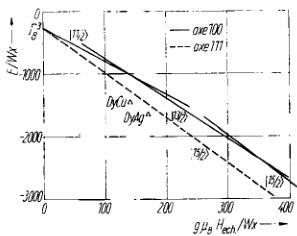 De plus, l'état fondamental électronique a été déterminé par effet Mössbauer [1]: Les valeurs du champ magnétique hyperfin et de l'interaction quadrupolaire ne peuvent s'interpréter avec les valeurs \( J_{z} = |11/2\rangle \) ou \( J_{z} = |13/2\rangle \) de moment du niveau fondamental, mais sont en bon accord avec une valeur \( J_{z} = |15/2\rangle \) .