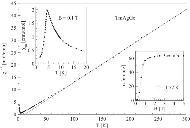 Fig. 1. Inverse magnetic susceptibility of TmAgGe. The solid line shows the Curie–Weiss fit discussed in text. The upper-left corner inset presents magnetic susceptibility at low temperatures. The bottom-right corner inset presents isothermal magnetisation curve during increasing (open symbols) and decreasing (filled symbols) of the magnetic field.