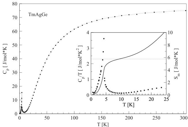 Fig. 3. Temperature dependence of the specific heat of TmAgGe. The inset presents the low-temperature part of \( c_{p}/T \) (dots) and magnetic entropy \( S_{m} \) (solid line). The entropy level \( Rln2 \) is marked by dotted line.