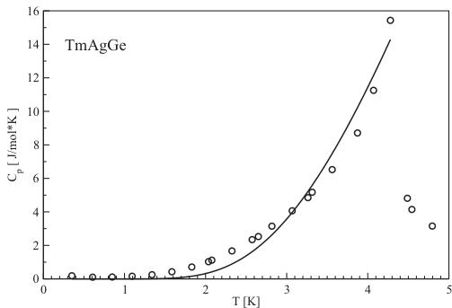 The temperature variation of the specific heat of TmAgGe is presented in Fig. 3. At the temperature of about 4.2 K a sharp lambda-shaped anomaly is seen, which should be related to the antiferromagnetic ordering.