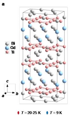 - Crystal structure / space group: Orthorhombic, Fmmm (No. 69). Consists of alternating layers of \( Ti_{3}Bi_{4} \), \( LnBi_{2} \), and Bi along the c axis. Features quasi-1D Gd zigzag chains along the a axis, leading to reduced crystalline symmetry (\( D_{2h} \)) in the \( LnBi_{2} \) layer.