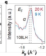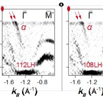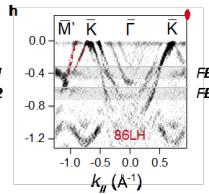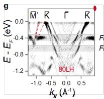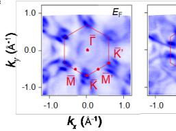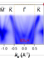 Figure 1c displays the 3D orthorhombic Brillouin zone (BZ) together with the pseudo-hexagonal projected 2D BZ. The reduced (two-fold) rotational symmetry is reflected in the pseudo-hexagonal projection featuring two equivalent \( \overline{M} \) and \( \overline{K}^{\prime} \) points, respectively. The ARPES constant energy