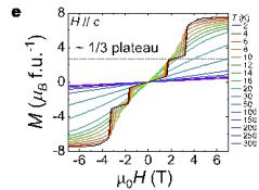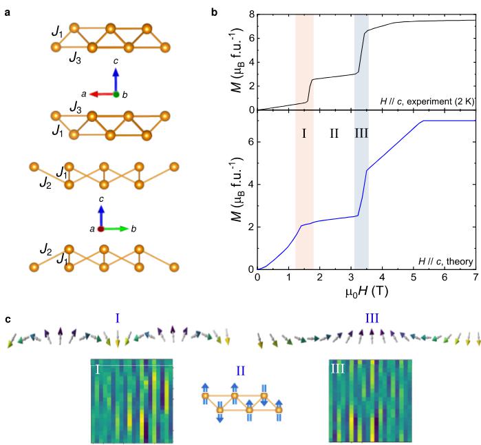 Correspondence and requests for materials should be addressed to E.J.C. (Erjian.Cheng@cpfs.mpg.de), R.L. (lourui09@gmail.com), Y.Z. (yangzhang@utk.edu), W.B.W. (wangwb1@shanghaitech.edu.cn) or C.F. (Claudia.Felser@cpfs.mpg.de). Figure 1 | Crystal structure and electronic structure of GdTi₃Bi₄. Side view (a) and bottom view (b) of the GdTi₃Bi₄ crystal structure, respectively. (c) Bulk and pseudo-hexagonal projected BZs with the high-symmetry points. (d) Temperature dependence of the zero-field resistivity \( \rho_{xx} \) (black curve) and magnetization (blue curve) with field applied along the c axis. Red ( \( T_{N}^{'} \) ) and green arrows represent the temperatures where two consecutive magnetic transitions take place. (e) Magnetic field dependence of magnetization at various temperatures with field applied along the c axis. A nearly one-third of the saturated magnetization (the 1/3 plateau) has been identified. (f) Constant-energy ARPES intensity plots (hv = 86 eV) at energies of 0, -0.3, and -0.5 eV, respectively. The red solid lines indicate the (001)-projected BZs. (g-i) Second derivative intensity plots (T = 25 K) recorded along the \( \overline{\Gamma}-\overline{K}-\overline{M}' \) direction with 80- (g), 86- (h), and 98-eV (i) photons, respectively. The red dashed curves are guides to the eye for the near- \( E_{F} \) band dispersions around \( \overline{M}' \) point. (j) DFT calculated bulk band structure along the \( \bar{M}^{\prime}-\bar{K}-\bar{\Gamma}-\bar{M}^{\prime} \) lines ( \( k_{z}=\pi \) plane) in the paramagnetic phase of \( GdTi_{3}Bi_{4} \) . (k) ARPES intensity plot (T=25 K, \( h\nu=83 \) eV) measured along the \( \bar{\Gamma}-\bar{K}-\bar{M}^{\prime} \) direction. (l) Second derivative intensity plot of (k) over the momentum range of \( -0.5 Figure 2 | Anomalous transverse transport measurements of GdTi₃Bi₄. (a) Transverse transport ( \( \rho_{yx} \) ) (bulk sample, S1) with current j and magnetic field applied along the a and c axis, respectively. (b) Magnetoresistance (MR) at different temperatures, which is defined as \( \mathrm{MR} \equiv 100 \times [\rho_{xx}(H) - \rho_{xx}(0)] / \rho_{xx}(0) \) . (c,d) A comparison of Hall resistivity, longitudinal resistivity, magnetization, and the first derivative of magnetic susceptibility at 2 K with magnetic field applied along the c axis. (e) Contour plot of the anomalous Hall resistivity ( \( \rho_{yx}^{A} \) ). The background color represents the values of \( \rho_{yx}^{A} \) . (f) Contour plot of magnetization as a function of the magnetic field applied along the c axis during the zero-field cooling process. The background color represents the differential values of magnetization with respect to the magnetic field. Phases I and III denote the states at the lower- and higher-field metamagnetic transitions, respectively. Phase II specifically corresponds to the regime of the 1/3 magnetization plateau. Figure 3 | Magnetic force microscopy (MFM) topography of the domain walls with the evolution of magnetic fields in GdTi \( _{3} \) Bi \( _{4} \) . (a) MFM images taken at 4 K with magnetic field applied parallel to the c axis. Stripe-like domain walls exist at two metamagnetic transitions. (b) Transverse transport ( \( \rho_{yx} \) ) (flake sample, S2) with magnetic field applied along the c axis. (c) The corresponding magnetoresistance (MR) at different temperatures. A comparison of magnetization (d) and Hall resistivity, and MFM signal at 4 K with magnetic field applied along the c axis. The arrows represent the field-sweeping direction. Figure 4 Figure 4 | Chiral magnetic structure of GdTi₃Bi₄ in magnetic fields. (a) Schematic illustration of the nearest, next-nearest, and next-next-nearest exchange couplings. (b) A comparison of the magnetization between experiments (2 K, the upper panel) and calculations (the lower panel). Magnetic field is applied parallel to the c axis. The pink (I) and blue (III) color bars represent the regime of two metamagnetic transitions at ~1.7 T and ~3.3 T, respectively. II represents the regime of 1/3 magnetization plateau. (c) Both in-plane and out-of-plane magnetic configurations before and after the plateau; arrows indicate the in-plane components, while domain walls represent the out-of-plane components. The out-of-plane magnetic configuration under the plateau has also been illustrated (II).Conclusions