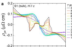 Figure 2a shows the transverse Hall resistivity profiles with the current applied along the a axis and the magnetic field along the c axis. At 2 K, as the magnetic field increases from 0 to 9 T, the Hall resistivity exhibits a jump at \( H_{1} \sim 1.71 \) T and then decreases sharply at \( H_{2} \sim 3.43 \) T, corresponding to the two metamagnetic transitions (Figs. 2c and 2d). Beyond \( H_{2} \) , where the magnetization increases more gradually, the Hall resistivity displays an additional hump. When the magnetic field surpasses the polarized field ( \( H_{3} \sim 4.5 \) T), the Hall resistivity exhibits non-linear behavior, suggesting the presence of multiple band features in \( GdTi_{3}Bi_{4} \) , as observed in ARPES experiments, and indicating a minimal contribution from the spontaneous anomalous Hall effect. With increasing temperatures, the Hall peaks are gradually weakened, and the profile at 16 K slightly larger than the ordering temperature shows no distinct anomaly. Figure 2b shows the MR with the same measured configuration, which displays similar behavior as Hall resistivity. \( GdTi_{3}Bi_{4} \) orders at 14.1 K, but the MR remains negative up to 30 K, suggesting a field-induced suppression of scattering from local moments. This observation also points to strong magnetic fluctuations in the paramagnetic state, aligning with the band splitting seen in ARPES measurements.
