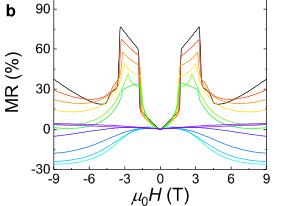 Recently, a domain wall skew scattering mechanism has been theoretically proposed and experimentally demonstrated in an A-type antiferromagnetic Weyl semimetal [52]. The contribution of domain walls to the Hall signal is expected to be proportional to the net magnetization at the domain walls. To investigate these contributions in \( GdTi_{3}Bi_{4} \) , the sample size was reduced to a few microns with a thickness of \( \sim200 \) nm (Supplementary Fig. 6), considering that the domain wall size is on the micron scale (Fig. 3a). Figures 3b and 3c display the Hall resistivity and MR of a flake sample (the inset to Fig. 3b), respectively. In sharp contrast to the bulk sample, the Hall resistivity of the flake sample shows spikes rather than jumps at the metamagnetic transition fields, while the MR profiles remain similar (Fig. 3c). For comparison, the Hall resistivity at 4 K is also plotted in Fig. 3e. At the higher-field metamagnetic transition, the spike in Hall resistivity aligns well with the RMS signal in MFM measurements and the jump in the Hall resistivity of the bulk sample. However, the spike at the lower-field metamagnetic transition occurs at a lower field. This difference may be due to variations in domain wall skew scattering or magnetization between the flake and bulk samples. Therefore, unlike the bulk sample, the flake sample in \( GdTi_{3}Bi_{4} \) exhibits both skyrmion-like AHE and an AHE enhanced by domain-wall skew scattering.