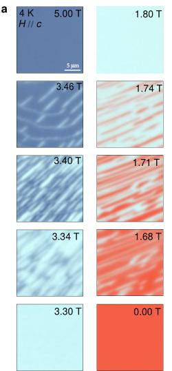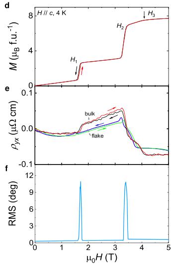 By plotting the field dependence of the Root Mean Square (RMS) value of MFM images together with Hall and magnetization data, as shown in Figs. 3d–3f, it is clear that the field evolution of the stripe domain walls aligns well with the abrupt changes observed in Hall resistivity and magnetization.